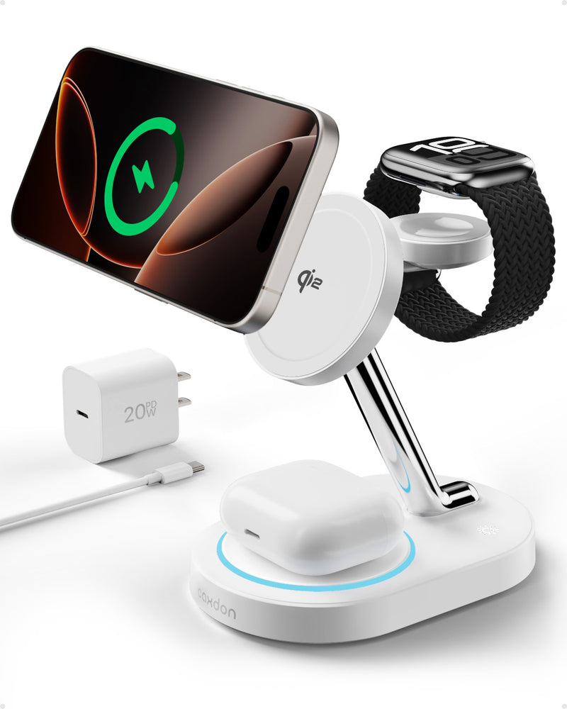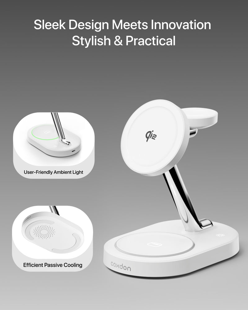 About this item𝐆𝐚𝐦𝐞 𝐂𝐡𝐚𝐧𝐠𝐞𝐫: Simplify your charging routine with this wireless charging station designed for Apple devices. Charge your phone, Apple Watch, and earbuds simultaneously, eliminating cable clutter and enhancing your daily charging experience.𝐑𝐞𝐥𝐢𝐚𝐛𝐥𝐞 𝐜𝐡𝐨𝐢𝐜𝐞: Get faster and more reliable charging with this advanced stand. It delivers up to 18W total output, 7.5W for iPhone, 10W (max) for Samsung/Android, 5W (max) for Airbuds/earbuds, and 2.5W (max) for Apple Watch.𝐔𝐧𝐢𝐯𝐞𝐫𝐬𝐚𝐥 𝐂𝐨𝐦𝐩𝐚𝐭𝐢𝐛𝐢𝐥𝐢𝐭𝐲: The charging station is universally compatible with iPhone 15 Pro Max to 8 series, Airpods above 2 gen, and other Qi-certified devices including Samsung, LG, Pixel, Motorola, etc. Note that the watch part is only for Apple Watch with a dedicated spot for your watch while charging other devices.𝐁𝐮𝐢𝐥𝐝 𝐭𝐨 𝐋𝐚𝐬𝐭: The wireless charging station is crafted with aluminum alloy materials and tested over 1000 times to ensure durability and high-quality performance. Trust in the exceptional value and reliability of our Apple device charger.𝐌𝐢𝐧𝐝-𝐛𝐥𝐨𝐰𝐢𝐧𝐠 𝐒𝐭𝐚𝐧𝐝: Elevate your charging setup with our sleek and space-efficient charging station. Its elegant metal exterior seamlessly blends with any decor, adding sophistication to your space and complementing the sleek aesthetics of your Apple devices. It's an excellent gift choice and perfect for your desk, nightstand, or office.